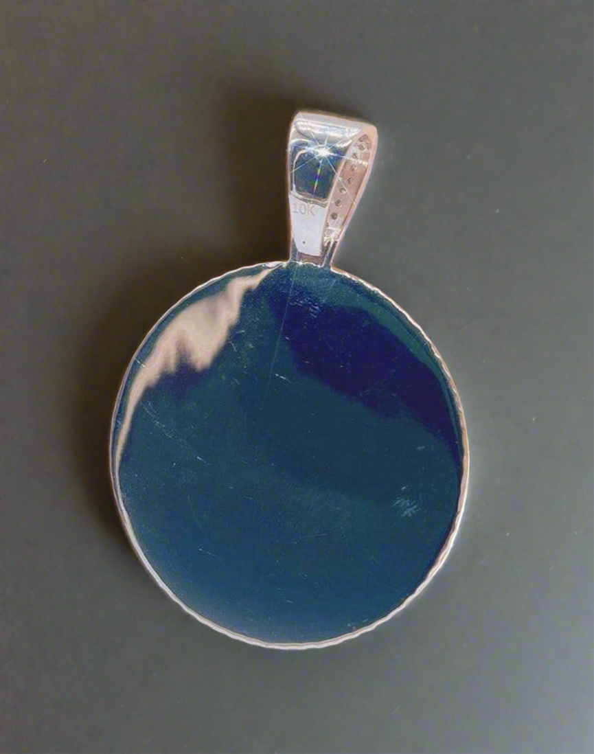Draped in very beautiful high clarity VVS Moissanite, this gorgeous encrusted 3 mm tennis chain is a site to see paired with a stunning 45mm photo pendant in case by FLAWLESS VVS moissanite.