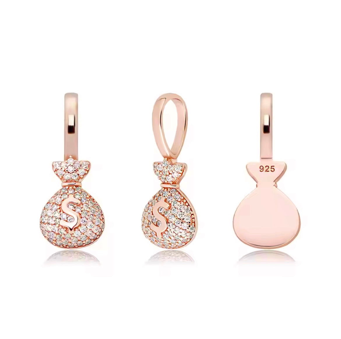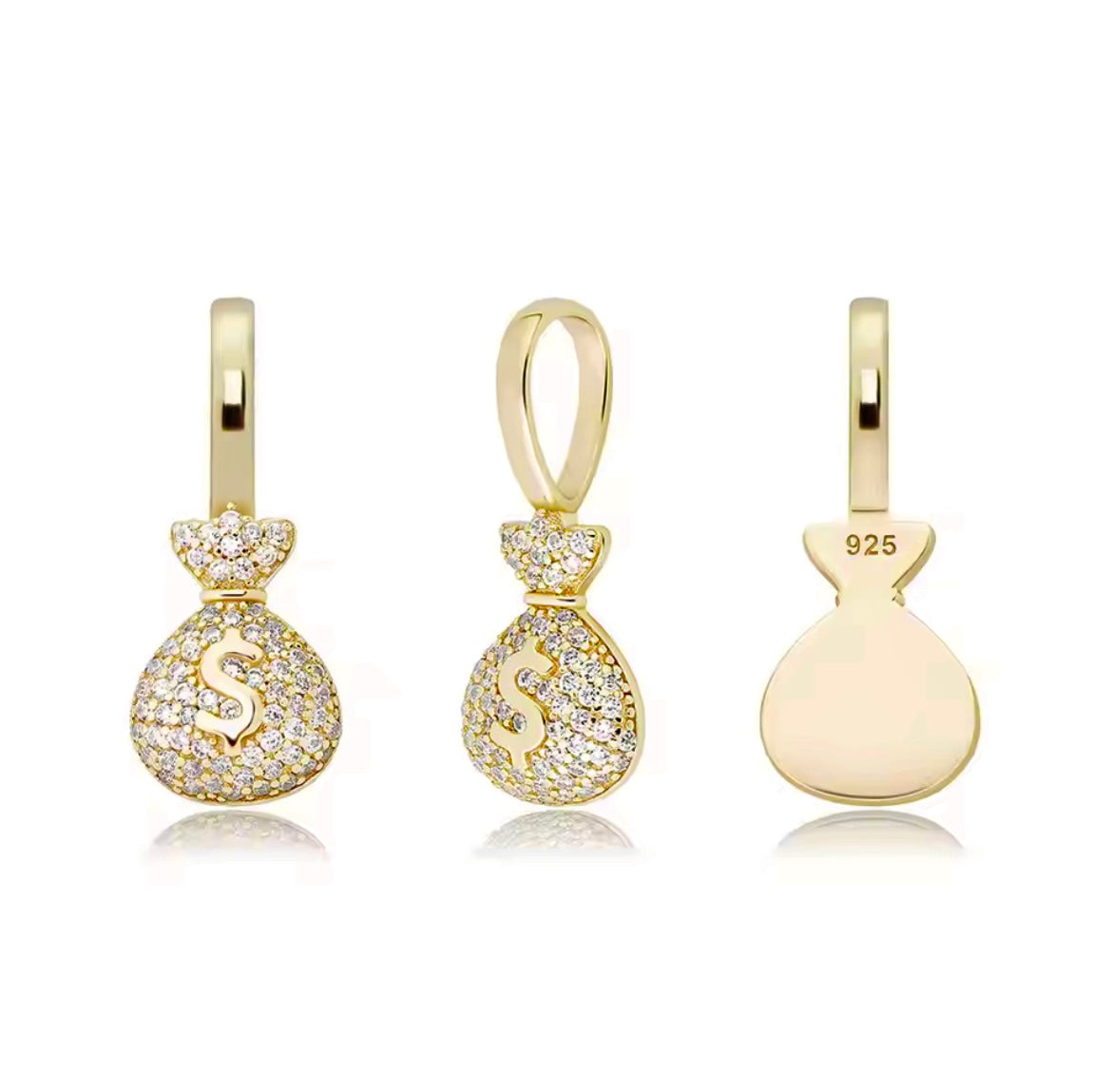 AMG Money bag is a very nice pendant perfect for every occasion goes with every outfit. This piece has a robust shine & sparkle with high clarity 5a Cz diamond. These money bags are made in Real YELLOW , ROSE, WHITE 14 K gold /925 Sterling silver (Chain Included). Each piece goes through a seven series process to ensure lifespan and durability of the piece.